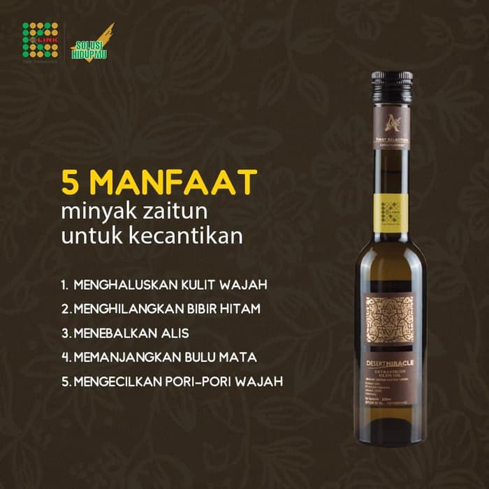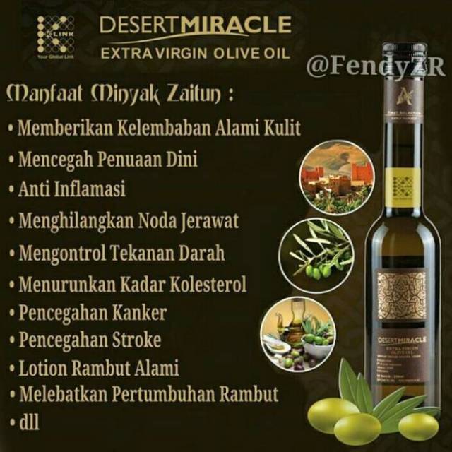Pohon zaitun bisanya tumbuh lambat memiliki batang yang keriput dan bewarna abu abu ramping dengan bentuk cabang yang pecah pecah. Juga digunakan sebagai minyak urut pijat dan campuran masker pada berbagai produk kecantikan. K link desert miracle evoo merupakan minyak zaitun tersohor dari ladang kaki pergunungan atlas di morocco dimana wilayah di sekitar gurun yang unik ini menghasilkan konsentrasi antioksidan yang amat sangat tinggi. Minyak zaitun atau olive oil adalah jenis minyak alami yang mengandung omega 9 dan vitamin e cukup tinggi.