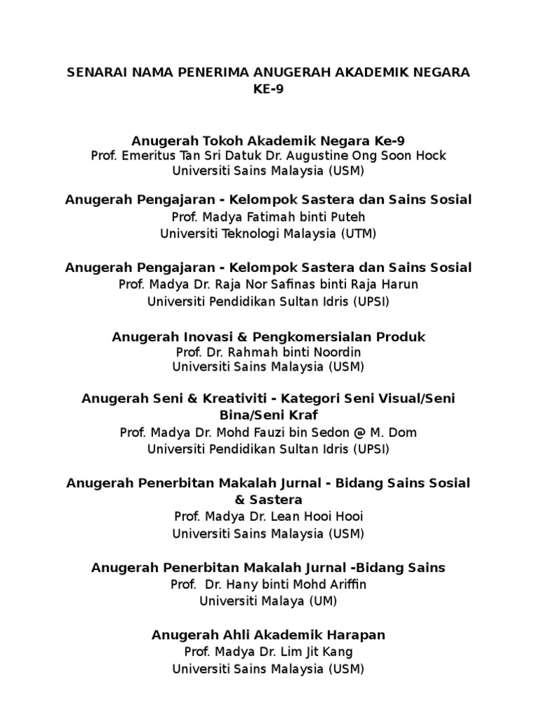 Tak sah senarai ini andai kita tak masukkan sasterawan negara terbaru yang dilantik. Senarai penerima adalah seperti berikut. Anugerah tokoh akademik negara prof. Tokoh akademik negara prof.