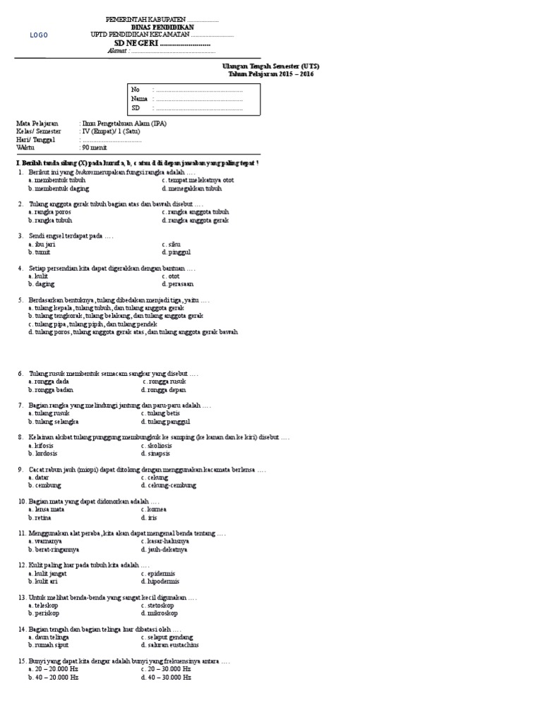 Soal Uts Ipa Kelas 4 Sem 1
